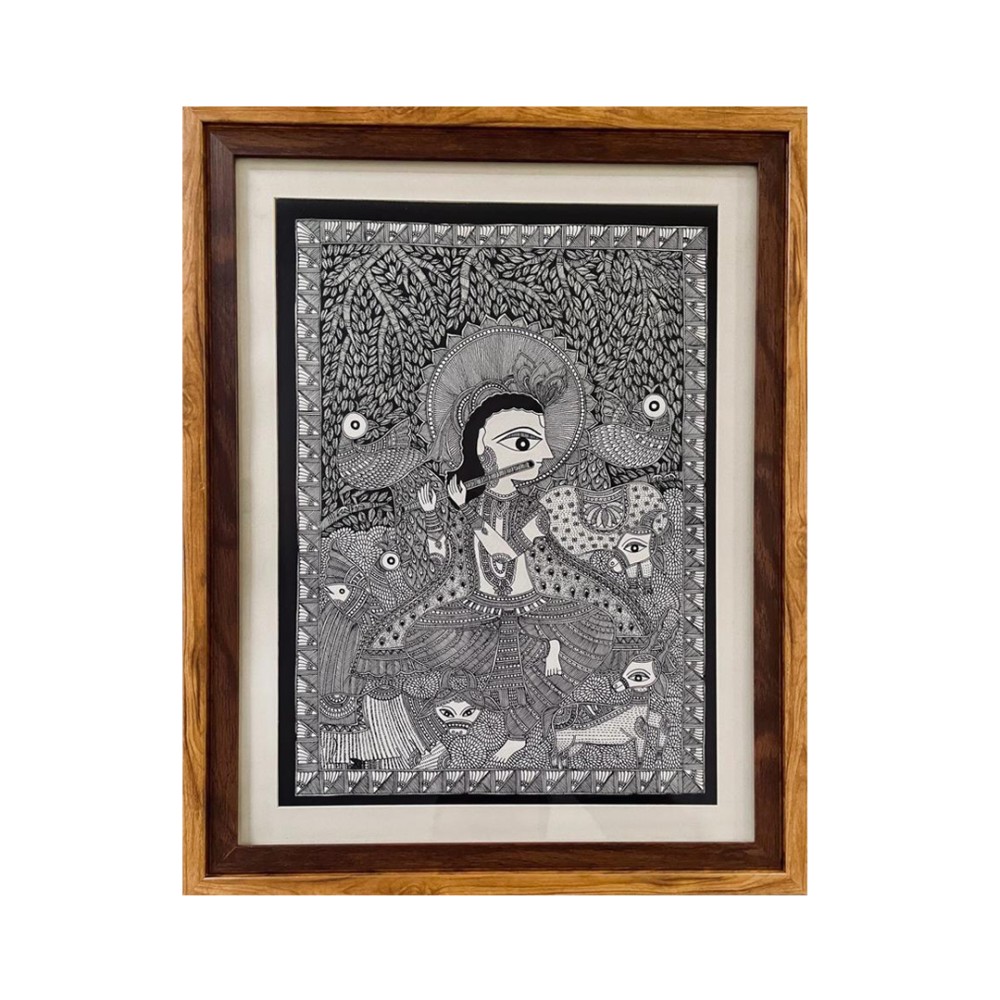 "Krishna flute ": Playing the enchanting tune of bliss and love, Krishna along with nature is depicting the everlasting harmonious relationship between the nature 'prakriti' and human 'purush'. To the either side of his face, the pair of peacock ties to the compassion and kindness in the supreme being. The cows around him, symbolic to wealth and abundance. With the radiance of a million suns, his beautiful figure emits benevolence, prosperity, and eternal pleasure, and creates an aura of positivity for your home. 100% hand crafted Madhubani Painting. Artist - Ms Pallavi Puri